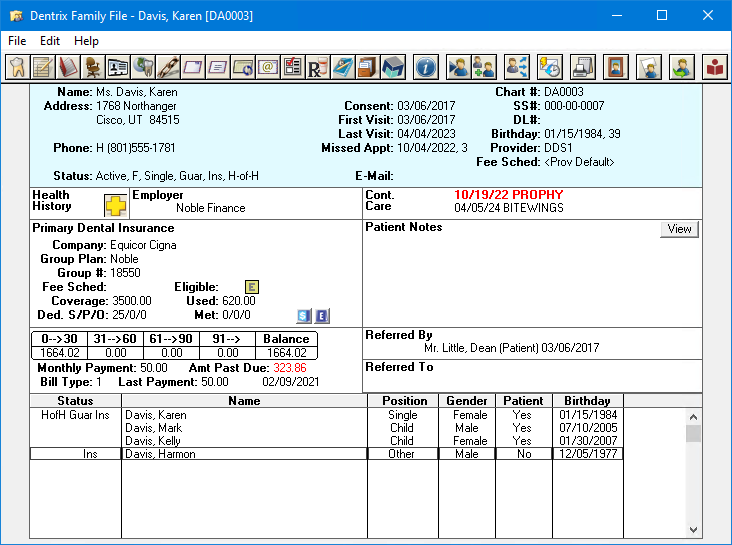 Family File - The Family File module manages patient and insurance information. From this module you will keep track of a patient's name, address, employer, insurance information, notes, and continuing care, as well as other important information.