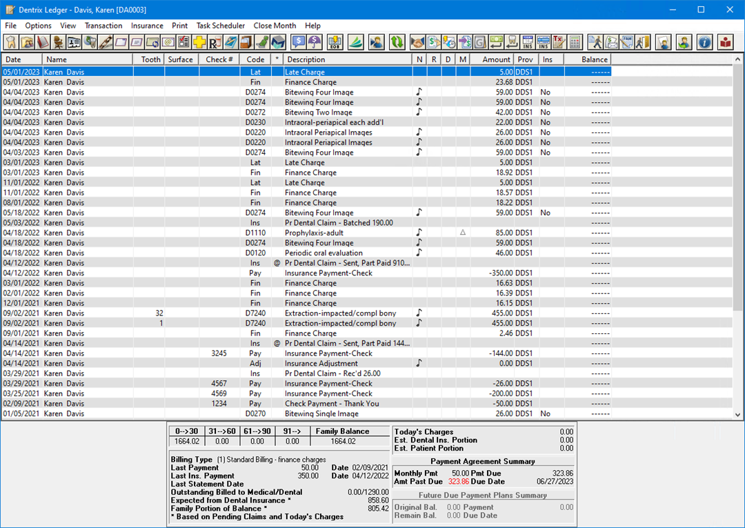 Ledger - Patient accounts are managed in the Ledger. Because Dentrix is a seamlessly integrated system, procedures completed in the Patient Chart are automatically posted in the Ledger. All financial transactions are recorded in the Ledger, including charges, payments, and adjustments. The Ledger provides information concerning patient portion versus insurance portion, deductibles owed, and payment arrangements.