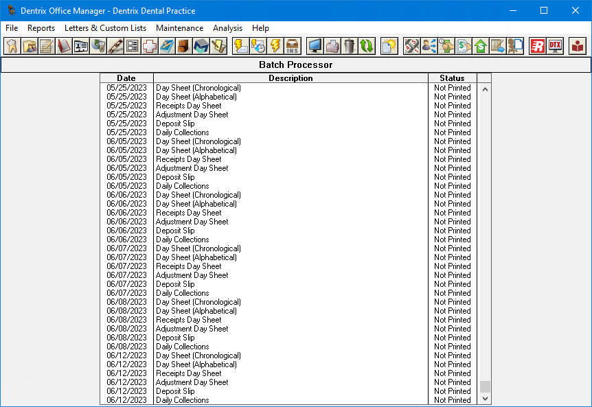 Office Manager - The Office Manager offers useful, customizable reports including day sheets, aging reports, financial reports, patient lists, reference reports, and more. Additionally, the Office Manager integrates with Microsoft Word to create effective, professional-looking letters that are available at the click of a mouse. These letters include welcome letters, congratulatory letters, thank you letters, and a variety of appointment and continuing care (recall) reminders, progress reports, and collection notices. The Office Manager contains a set of utilities and commands that make customizing Dentrix easy.