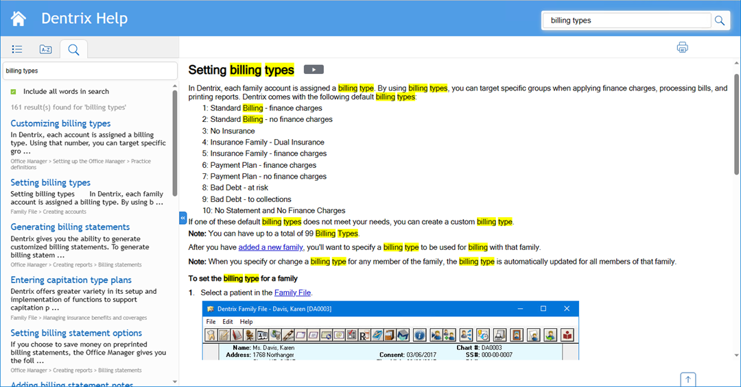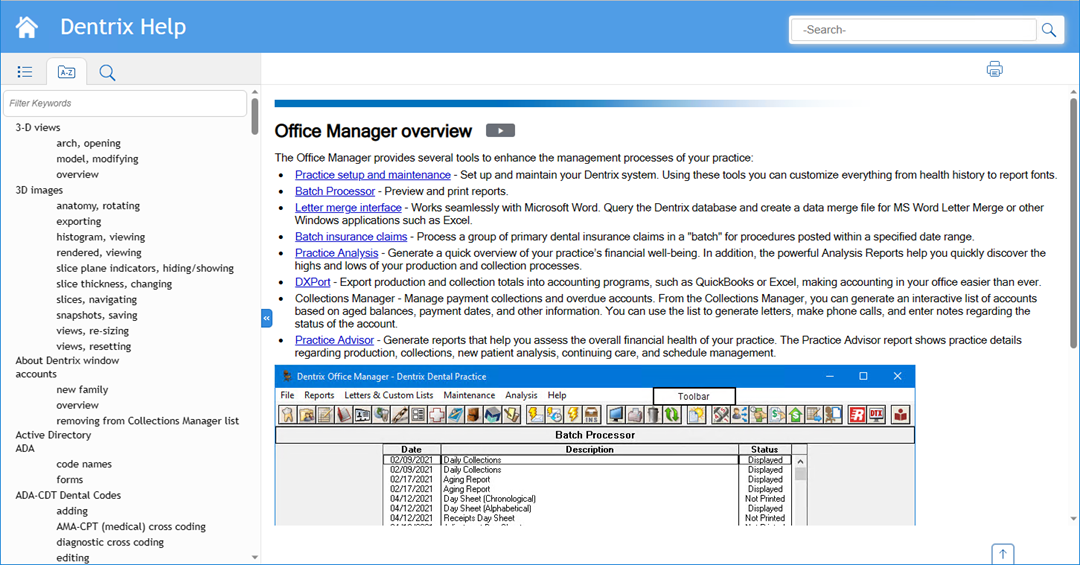 Using Dentrix Help, you can easily find the information you are looking for by clicking the three icons in the left pane: