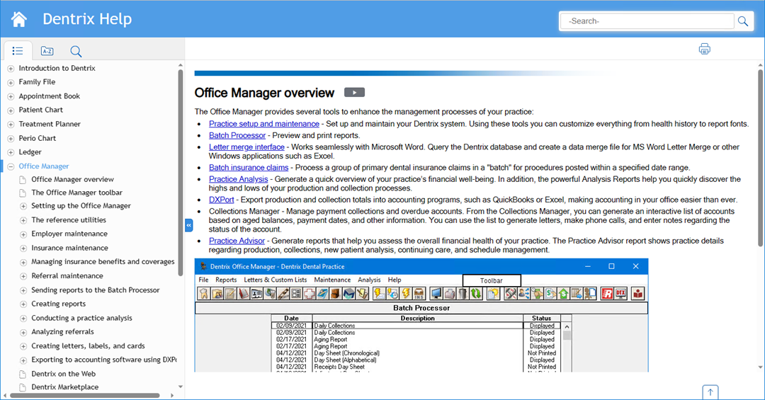 Table of Contents icon - Lets you browse the Help file's table of contents. Help topics are organized by Dentrix modules and features. To expand the contents of a module or topic, click the + sign next to a module's or a topic's title, and then click the desired topic.