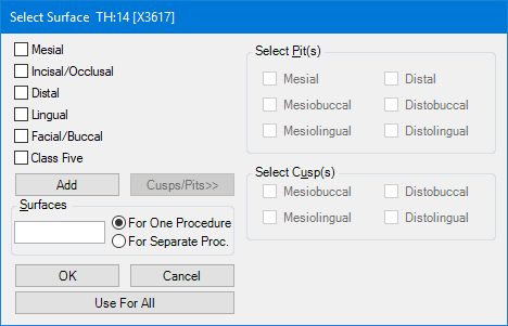 If the procedure you selected requires further treatment information, such as surfaces or quadrants, the Select Surface dialog box appears.