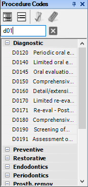 You can add treatment to a patient in the Patient Chart using any of three methods. The Procedure Codes panel consists of a list of Procedure Code categories, and each category contains a list of related procedure codes. From the Procedure Codes panel, you can add treatment when the procedure code you are entering is not assigned to a procedure button or when you are adding a treatment that requires more than one procedure code.