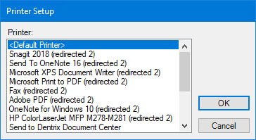 The Printer Setup dialog box appears listing all installed Windows printers.