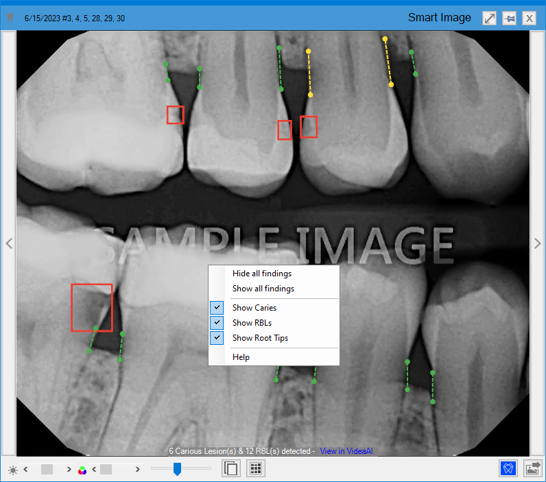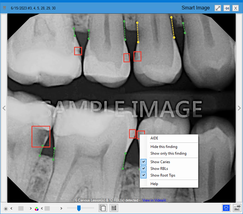 Note: By default, caries, RBL, and root tip indicators always appear when images are analyzed with Dentrix Detect AI. You can also hide the indicators by clearing one or more of the check marked indicators.