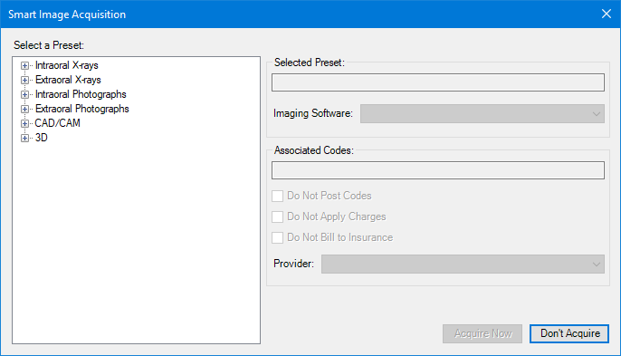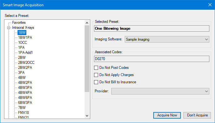 2. Under Select a Preset, click the image type (Intraoral X-rays), and then the specific type of image (1BW) you want to capture.
