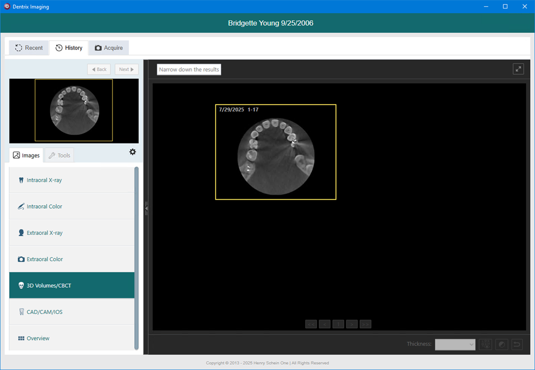 The 3D volumes/CBCT modality displays all 3D volumetric and cone beam computed tomography (CBCT) images for the selected patient in a chronological tiled view. Opening an image in the single-image view provides you with access to a variety of tools for detailed analysis and editing, enhancing the examination of volumetric data.