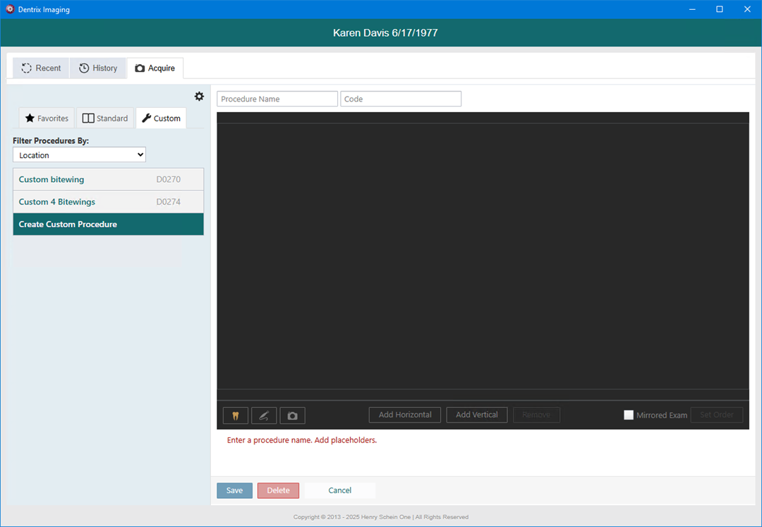 Dentrix Imaging comes with several default imaging procedures. However, you can create, edit, and delete custom imaging procedures. A custom imaging procedure will be available to every user who has rights to acquire images.