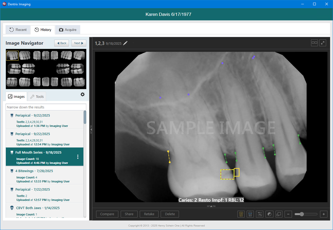 · Click any single image (intraoral X-ray, intraoral photo, extraoral photo, extraoral X-ray, CAD/CAM scan, or 3D volume) or an image within a series (such as a full mouth series or bitewings).