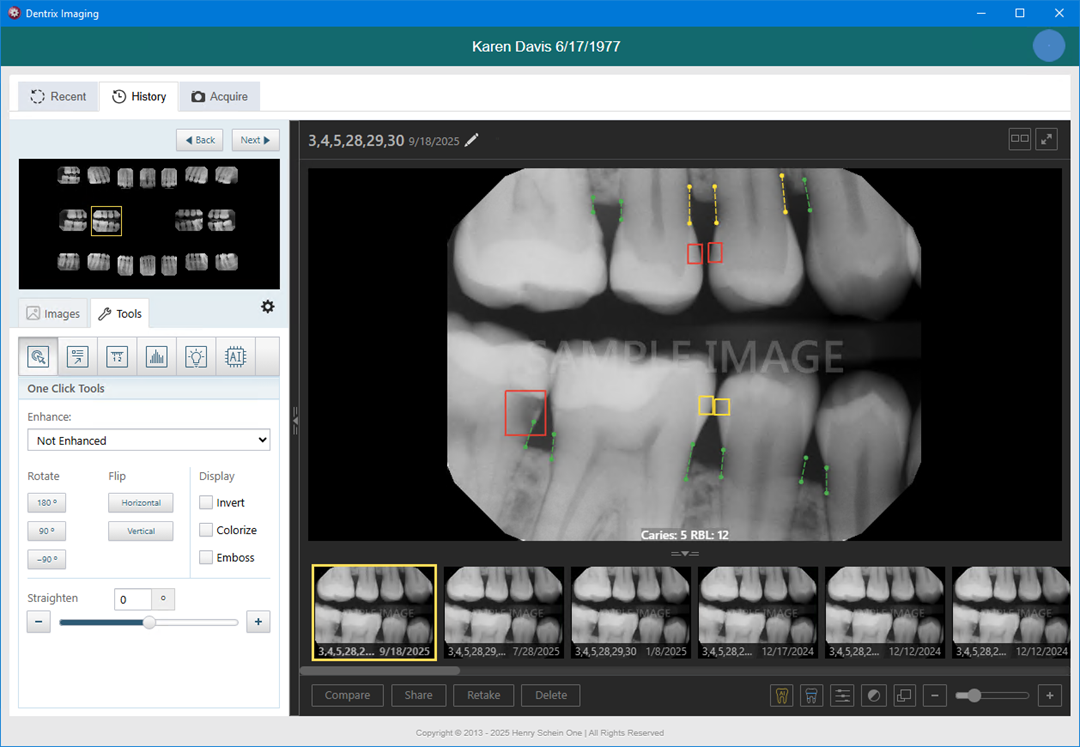 You can open Videa AI on Videa Health’s website from Dentrix Imaging. The website provides tools for viewing images in greater detail, filtering caries by severity (size), and comparing two images to see changes over time.