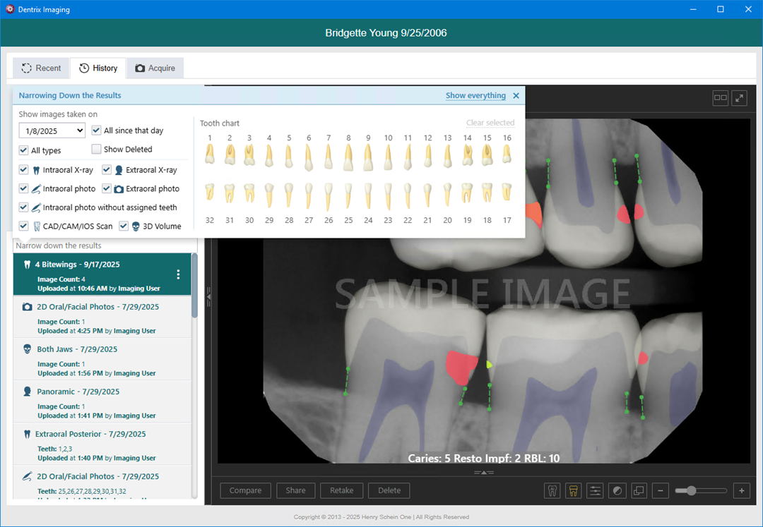 · Type – To view images in any category (intraoral X-rays, intraoral photos, intraoral photos without tooth numbers assigned, extraoral X-rays, extraoral photos,CAD/CAM scans, and 3D volumes), select the All types check box. To view images in only certain categories, make sure the check boxes of only those categories are selected; the other check boxes must be cleared.