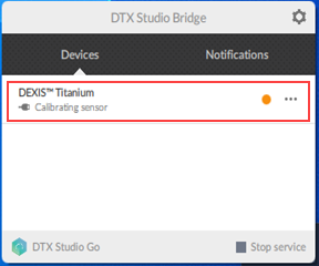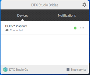 DEXIS Titanium – Connect the sensor. The calibration files download automatically. To confirm that the sensor is connected and that the calibration files downloaded, in the System Tray, click the DTX Studio Bridge icon. The DTX Studio Bridge dialog box appears. The green dot indicates that the Titanium sensor is ready to use.