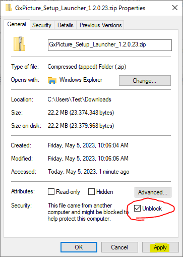 Clear the Unblock checkbox.