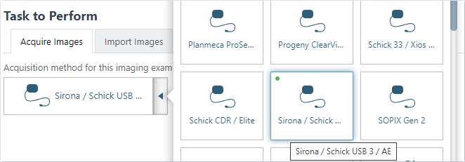 4. In the Acquisition method for this imaging exam menu, click Sirona/Schick USB 3/AE.