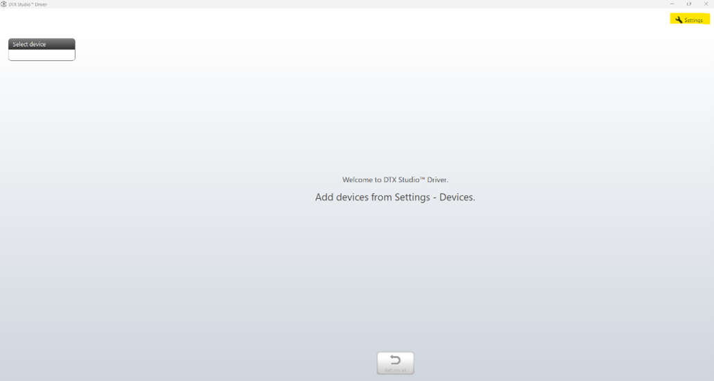 The DTX Studio dashboard appears. If no device is listed, click Settings.