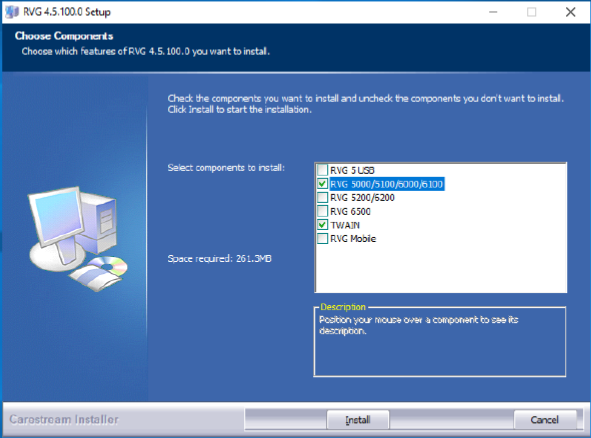 4. Select the appropriate device drivers for your Kodak RVG hardware and TWAIN, and then click Install.
