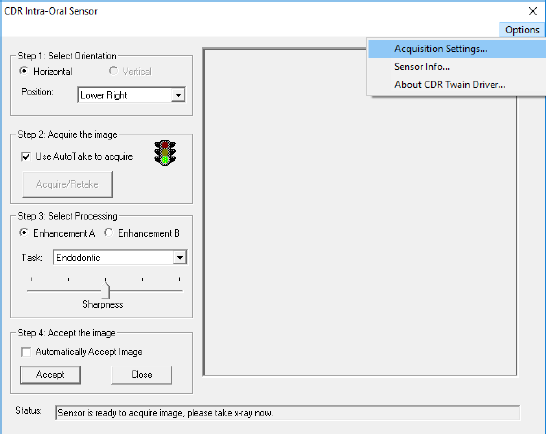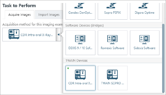 4. In the Acquisition method for this imaging exam menu, under TWAIN Devices, click CDR Intra-oral X-ray Acquisition, and then click Start.