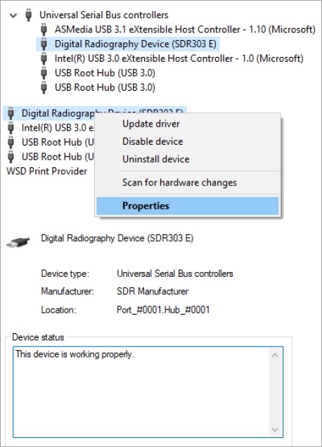 2. Click Universal Serial Bus controllers, and then right-click Digital Radiography Device (SDR303 E).