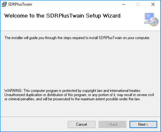 The Welcome to the SDRPlusTwain Setup Wizard screen appears.