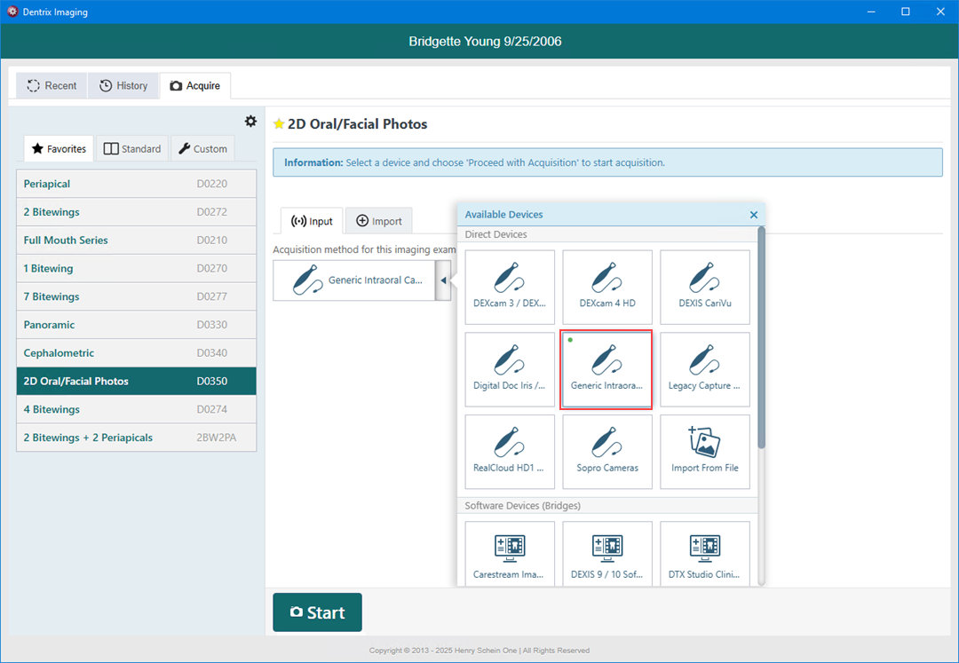 3. In the Acquisition method for this imaging exam menu, click Generic Intraoral Camera, and then click Start.
