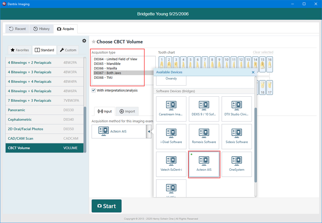 4. In the Acquisition method for this imaging exam list, click Acteon AIS, and then click Start.