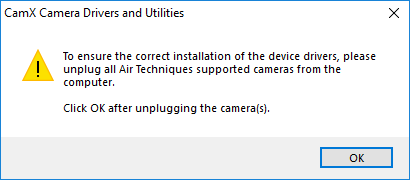 7. If the Setup prompts you to unplug CamX camera devices, make sure no cameras are attached to the computer, and then click OK.