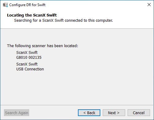 Note: If the device is not connected or is not powered on before you click Finish, you may receive a message stating "No ScanX Swift could be found." If the message appears, make sure the power is on and that it is properly connected, and then click Search Again.