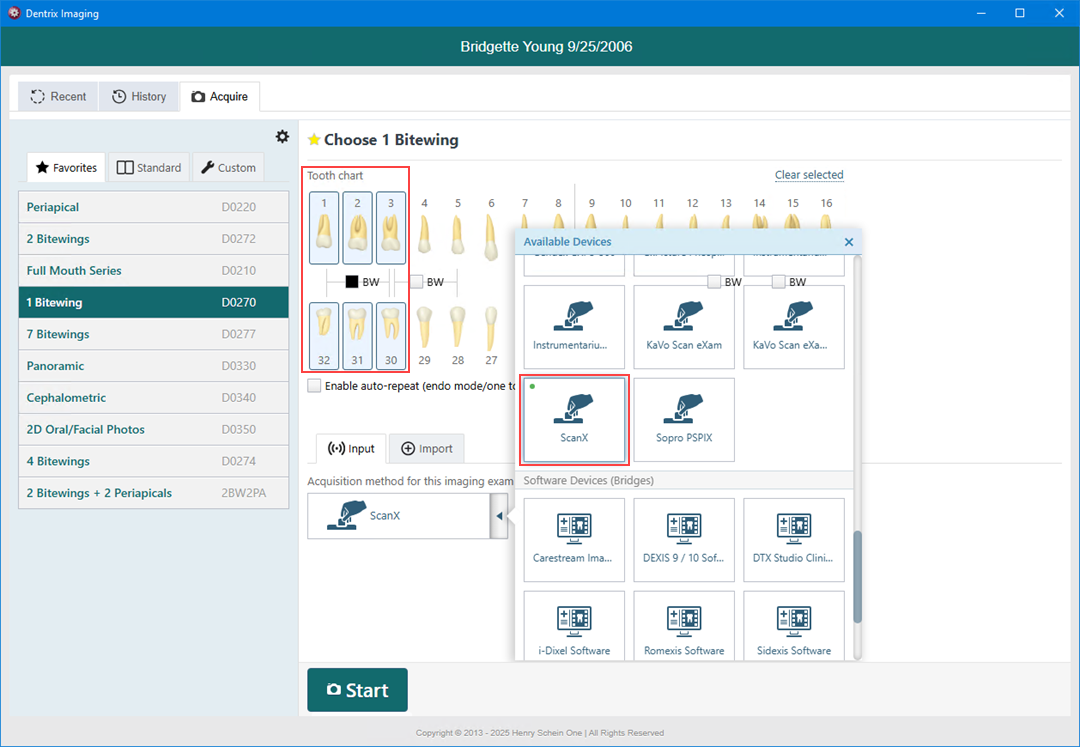 3. In the Tooth chart, click the teeth you want to image.