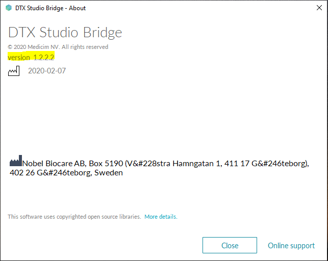 To view the version of DTX Studio Bridge that you are using, click the DTX Studio Bridge icon in the system tray, click the gear icon, and then select About. The version number appears; make sure that it meets or exceeds the minimum version number listed in the "Minimum Versions" section.
