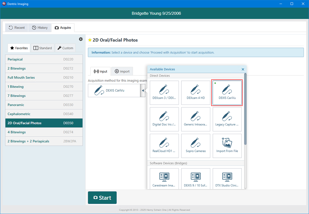 3. In the Acquisition method for this imaging exam menu, click DEXIS CariVu, and then click Start.