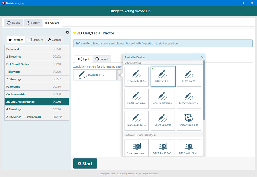 3. In the Acquisition method for this imaging exam menu, click DEXcam 4 HD, and then click Start.