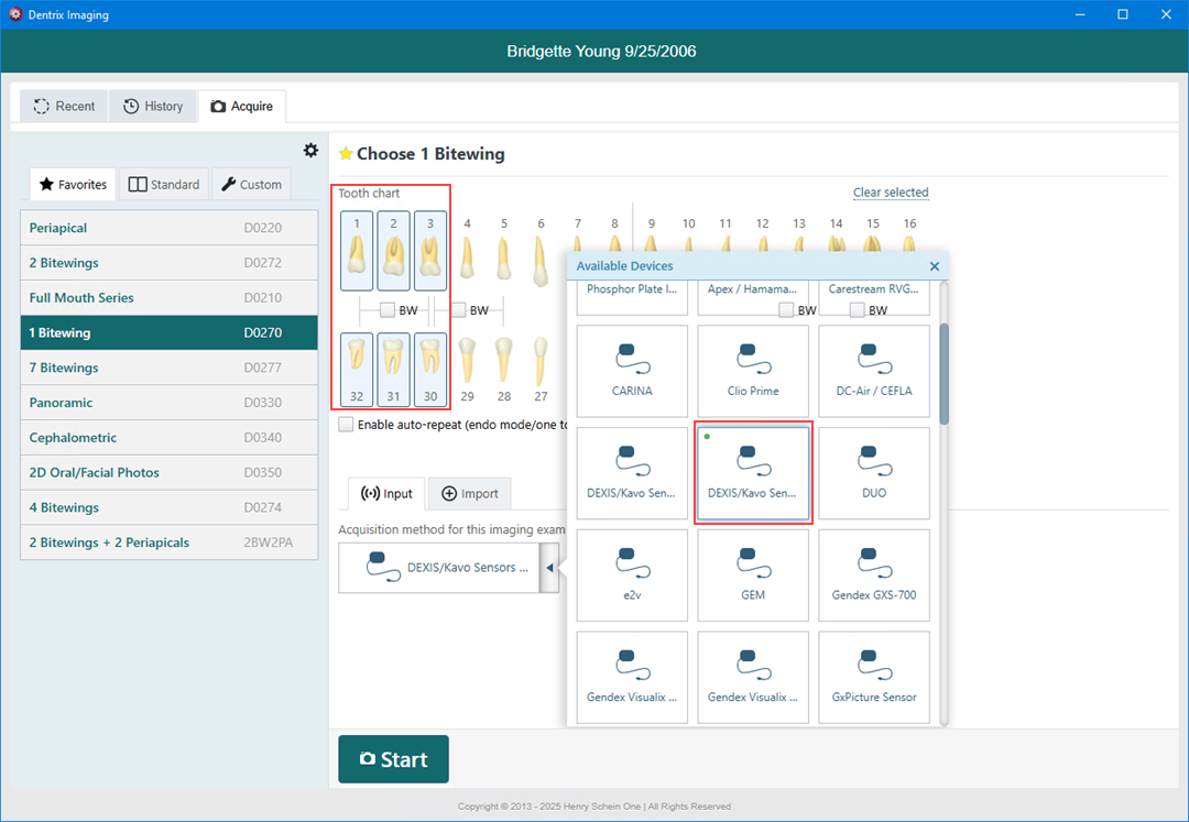 4. In the Acquisition method for this imaging exam menu, click DEXIS/KaVo Sensors (DTX Studio Bridge), and then click Start.