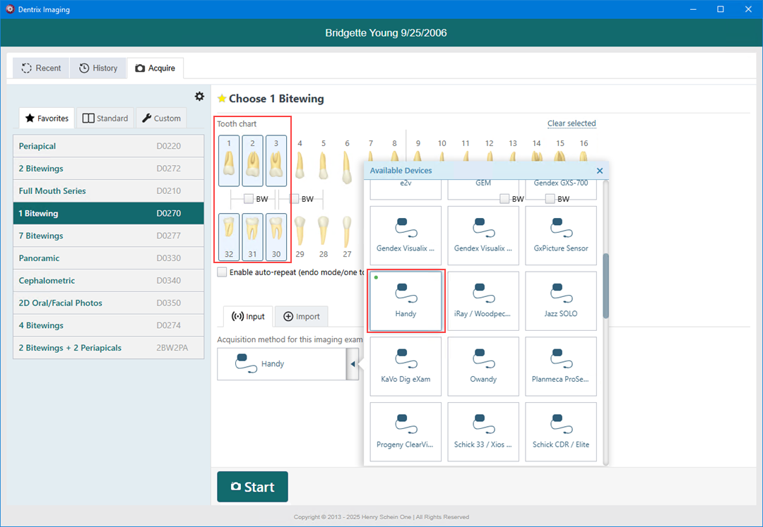 Dentrix Imaging supports acquiring intraoral images from the Handy intraoral X-ray sensors on computers running the Windows operating system. Drivers for the Handy sensor must be installed on each computer that the Handy sensor will be connected to. You must also install the calibration (correction) files on each computer that you connect the Handy sensor to.