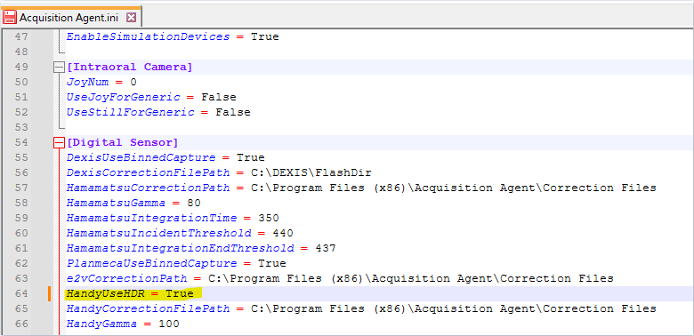 If you do not like the image quality produced by your Handy HDR sensor, you can enable the HDR setting for the sensor in the Acquisition Agent.ini file. This setting affect the high dynamic range for the sensor; with high dynamic range enabled, the image quality may improve.