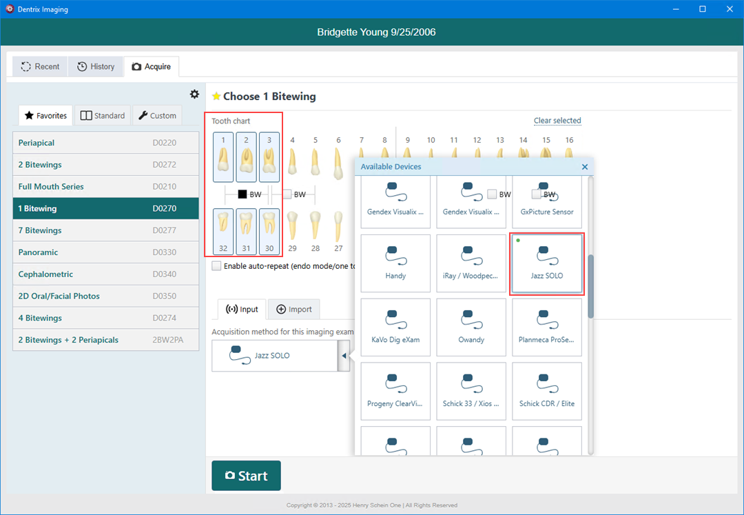 3. In the Tooth chart, click the teeth you want to image.