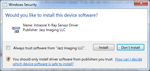 Dentrix Imaging supports acquiring intraoral images from the Jazz Solo intraoral X-ray sensors on computers running the Windows operating system. Drivers for the Jazz Solo sensor must be installed on each computer that the Jazz Solo sensor will be connected to.