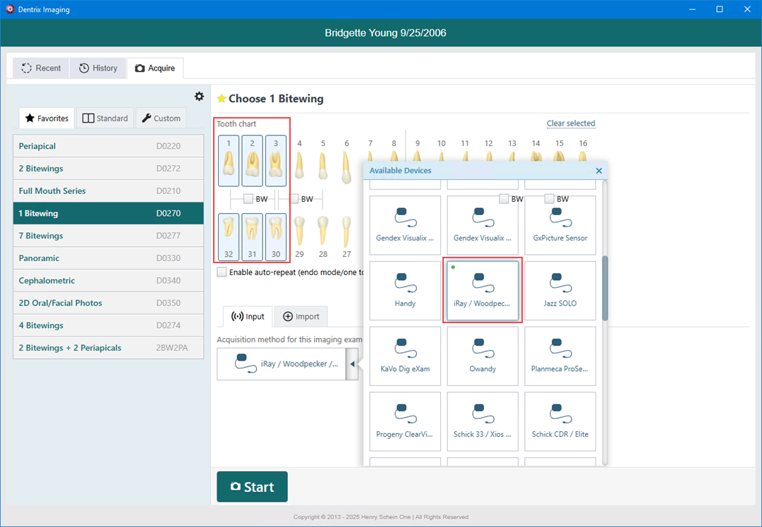 4. In the Acquisition method for this imaging exam menu, click iRay/Woodpecker/Eighteeth, and then click Start.