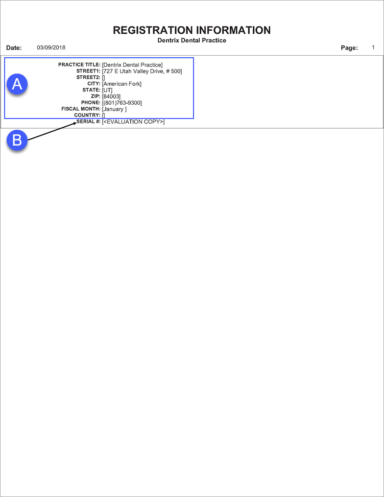 The Registration Information Report displays the practice’s registration information and Dentrix serial number.