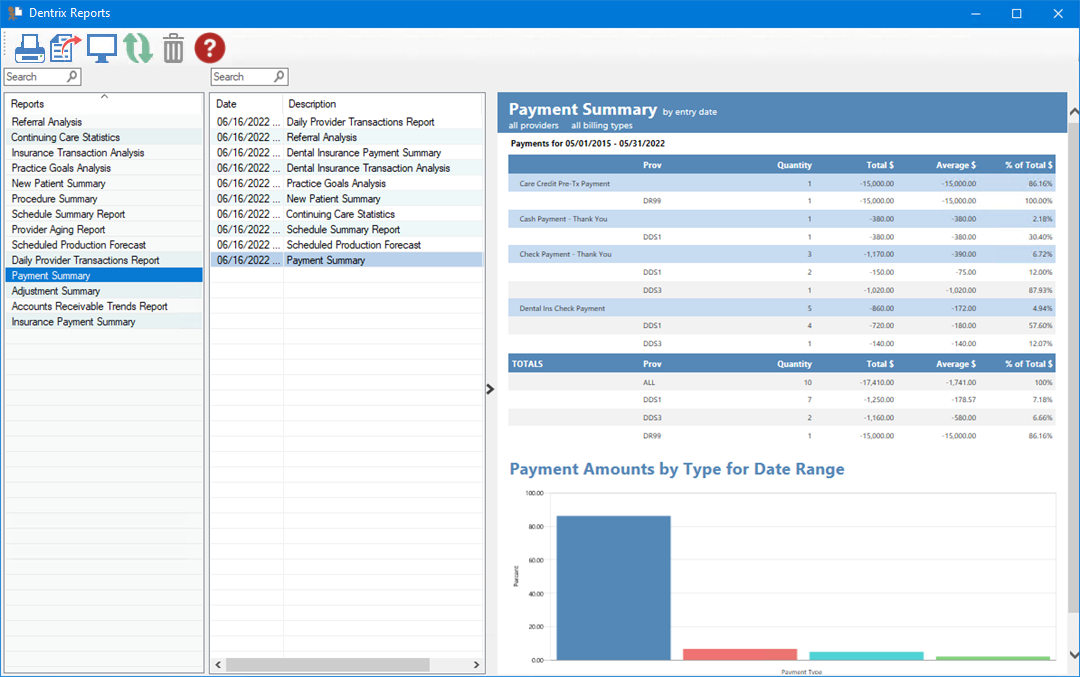 You can use a Payment Summary to review the guarantor and insurance payments applied during a date range in a numerical and a graphical format. You can preview, print, or send via email previously generated reports at any time after you have generated them.