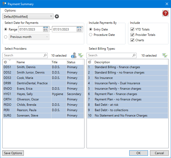 Include Payments By – Sets options to include transactions by entry date or procedure date.