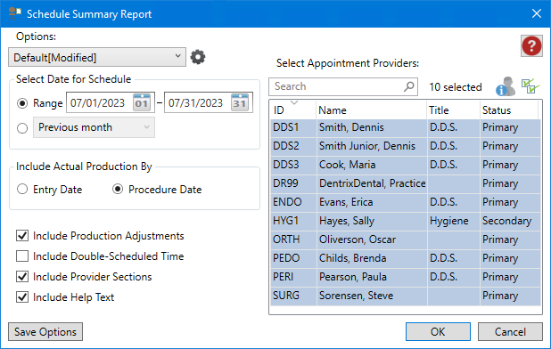 The Schedule Summary Report gives you vital statistical data regarding the effectiveness of your scheduling system. Statistics noted in the report include total scheduled time and percentages, total number of appointments, and production breakdowns for scheduled appointments. You can preview, print, or send via email previously generated reports at any time after you have generated them.