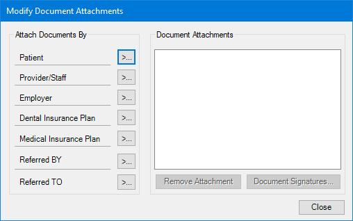 Note: You can attach the document to a Patient, Provider/Staff, Employer, Dental Insurance Plan , Medical Insurance Plan , Referred BY, and/or a Referred TO source.
