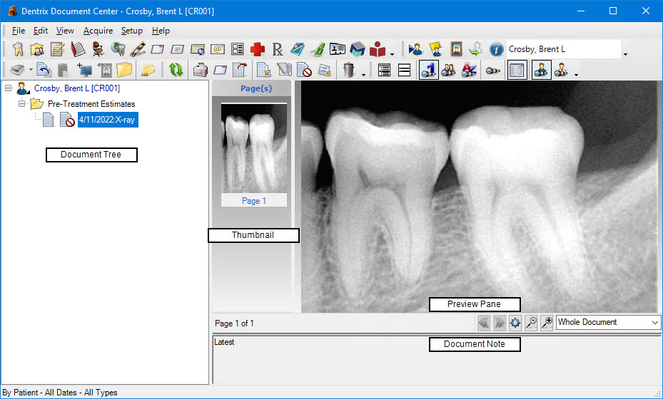 The Document Center window includes several tools and features to help you manage documents such as patient letters, EOBs, referral letters, and images (such as patient pictures and X-rays) that are scanned, captured, and imported. These tools and features include: