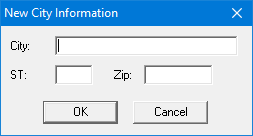 4. Type the city's name, its two-letter postal code, and ZIP Code in the appropriate fields, and then click OK.