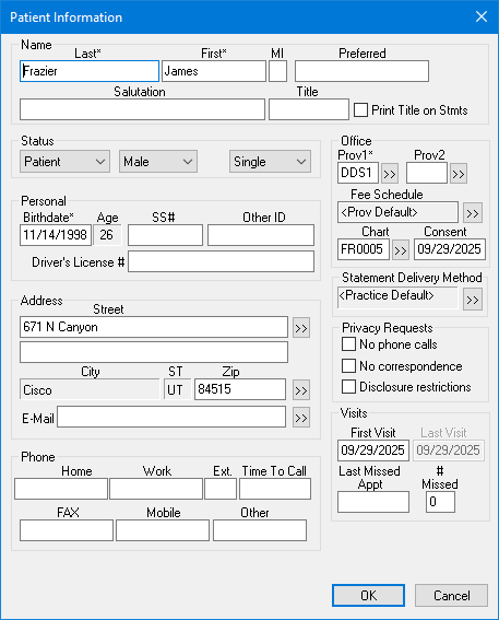 For new patients, any information you entered in the Add a New Patient dialog box appears.