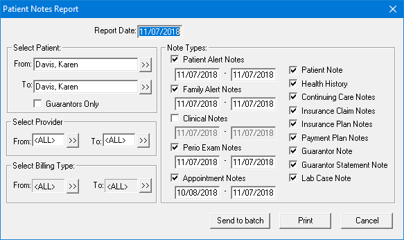 Perio Exam Notes - Print all notes entered in the Diagnostics pane in the Perio Chart. Type a date range for entered notes.