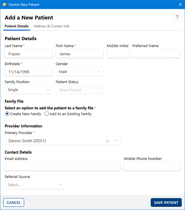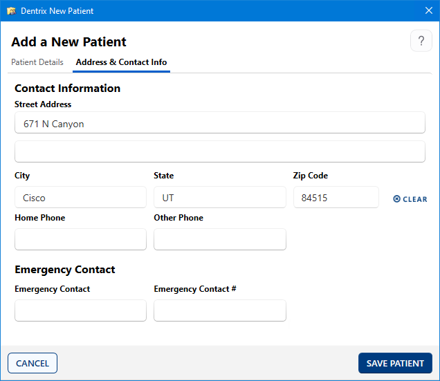 4. To complete the patient's contact information, click the Address & Contact Info tab.