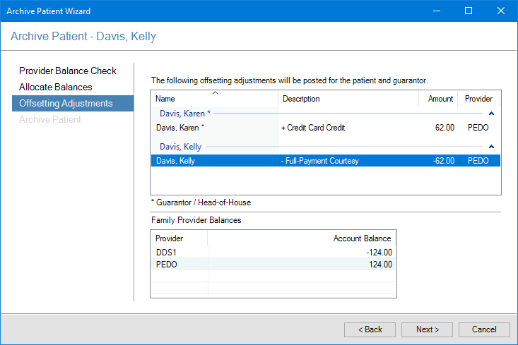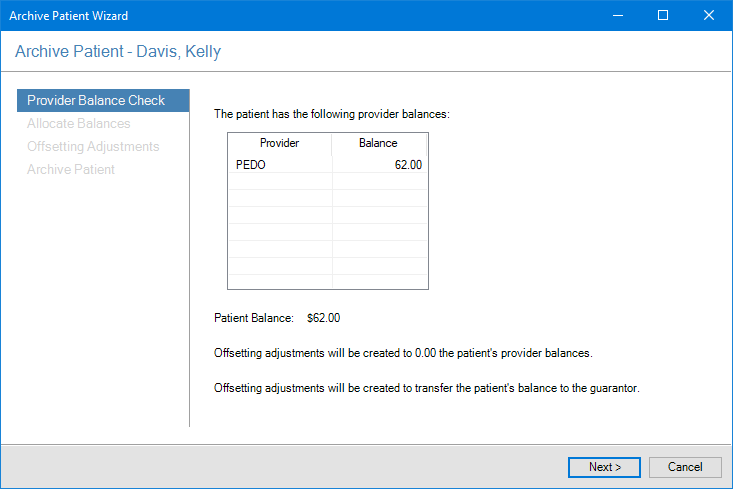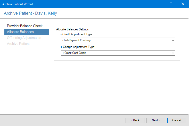 Before you can archive a patient, you must allocate and post any outstanding balances the patient may have for the patient and guarantor. Using the Archive Patient Wizard, you can check for and display any outstanding balances. You can then post offsetting adjustments for the patient and guarantor according to the adjustment types you have set for allocating balances.