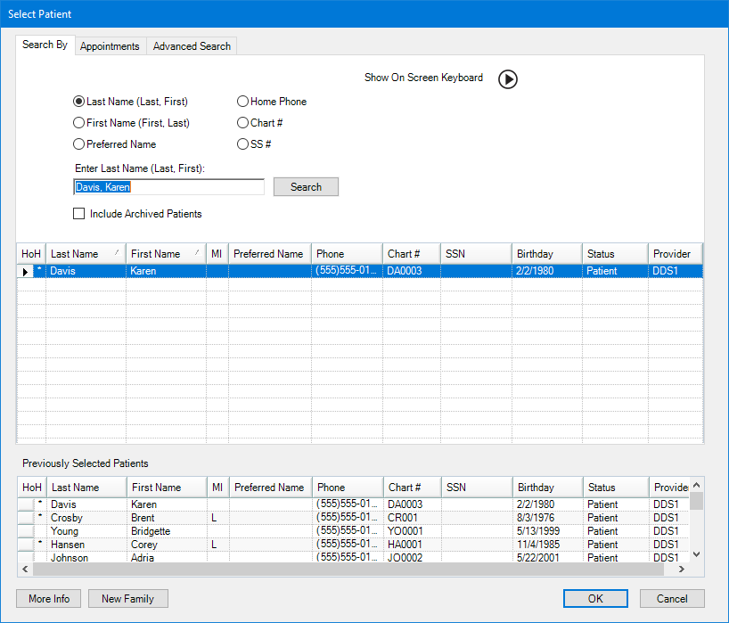 Note: If you cannot find the referral source’s name, first check the spelling. If you still cannot locate the source’s name, you have not created a family account for the referral source in the Family File, or the source is not one of your patients.
