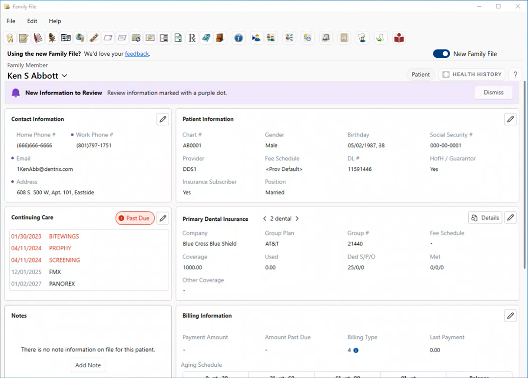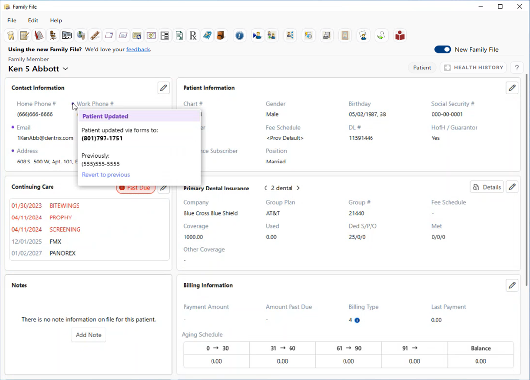 Whenever a patient’s information is updated in Dentrix Forms, a notification banner now appears under the selected patient’s name. If desired, you can reverse these updates.